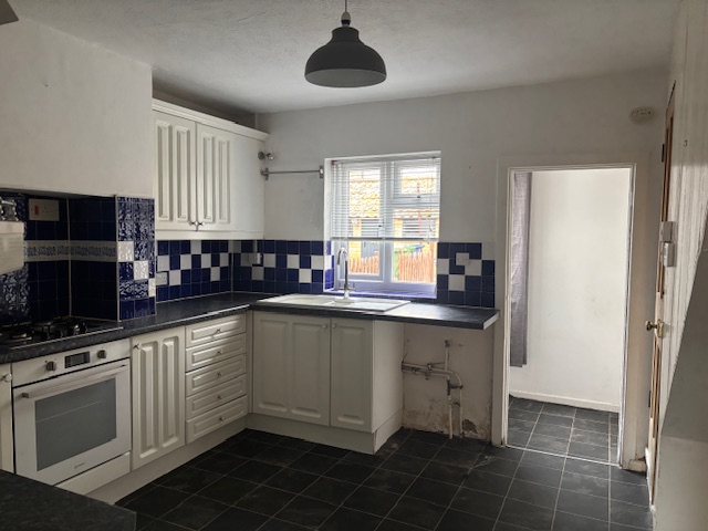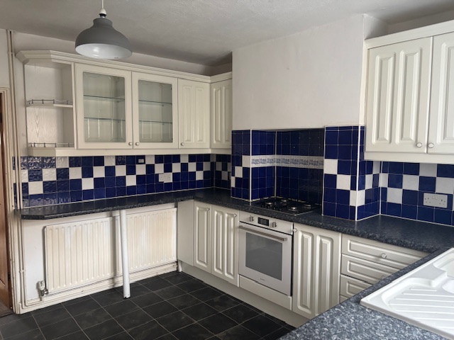 Kitchen: A range of white panelled wall and base units offering plenty of storage. Grey granite effect laminate worktop. White walls, with blue/white tiled splashbacks. Gas hob, electric oven, sink and drainer with mixer tap. Plumbing available for a washing machine and space for further appliance. Dark grey tiled effect vinyl flooring. Stairs leading to first floor.