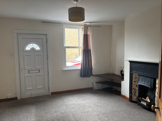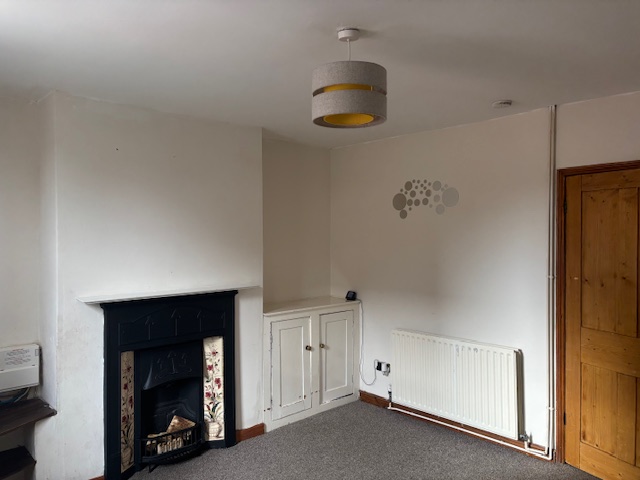Lounge: White walls, neutral carpet and curtains. Feature fireplace, built in storage cupboard. Country style oak door leading to the kitchen. Phone socket. Virgin Media box.