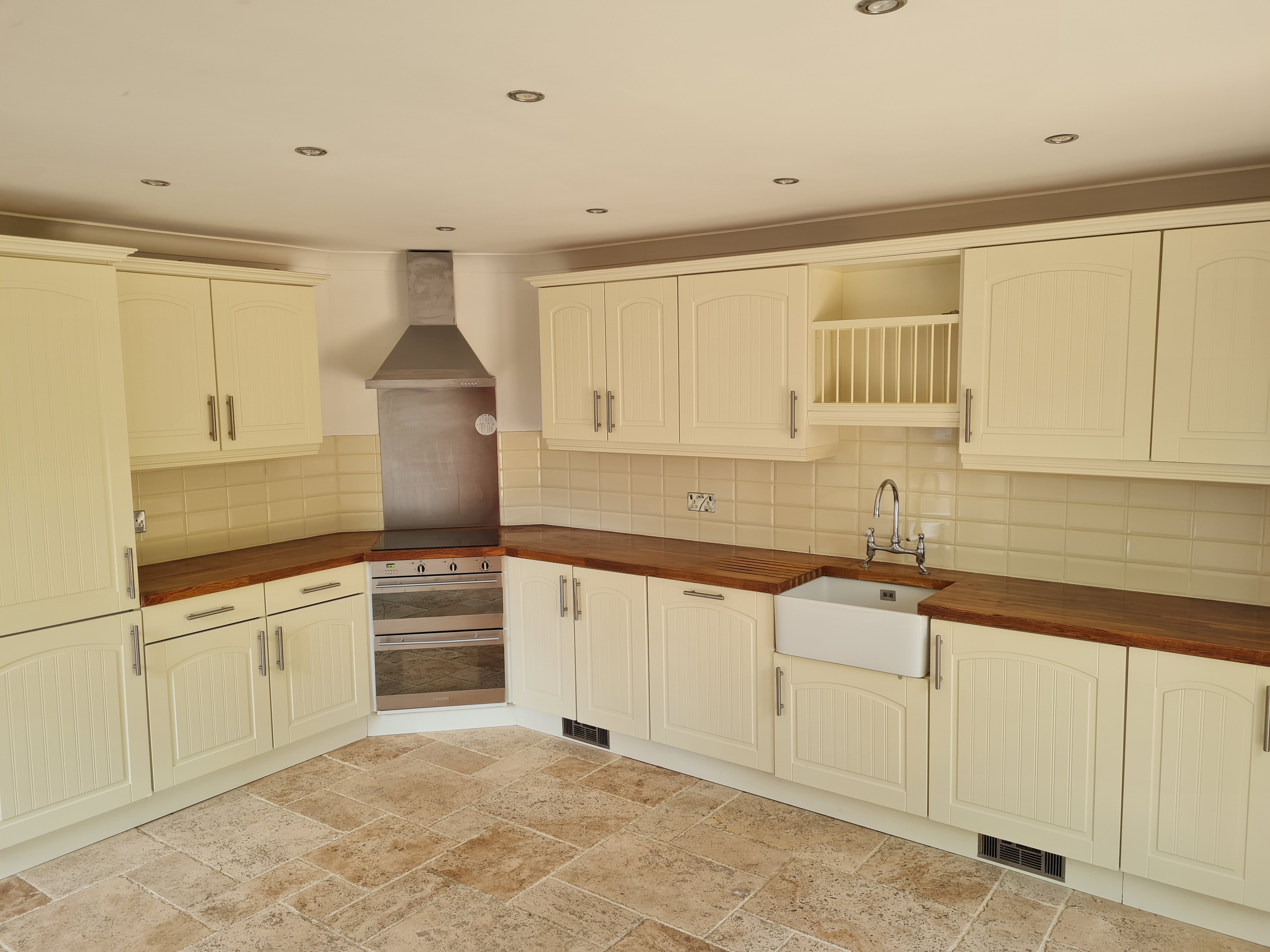 Kitchen/breakfast room:  Cream shaker style fitted kitchen with solid wood worktop.  Integrated Beko fridge/freezer and Neff dishwasher.  Baumatic electric oven, grill and hob with extractor hood.  Ceramic butler sink with chrome mixer tap.  White walls with cream tiled splashbacks and beige tiled floor.  French doors lead into the garden and a side door offers further access.