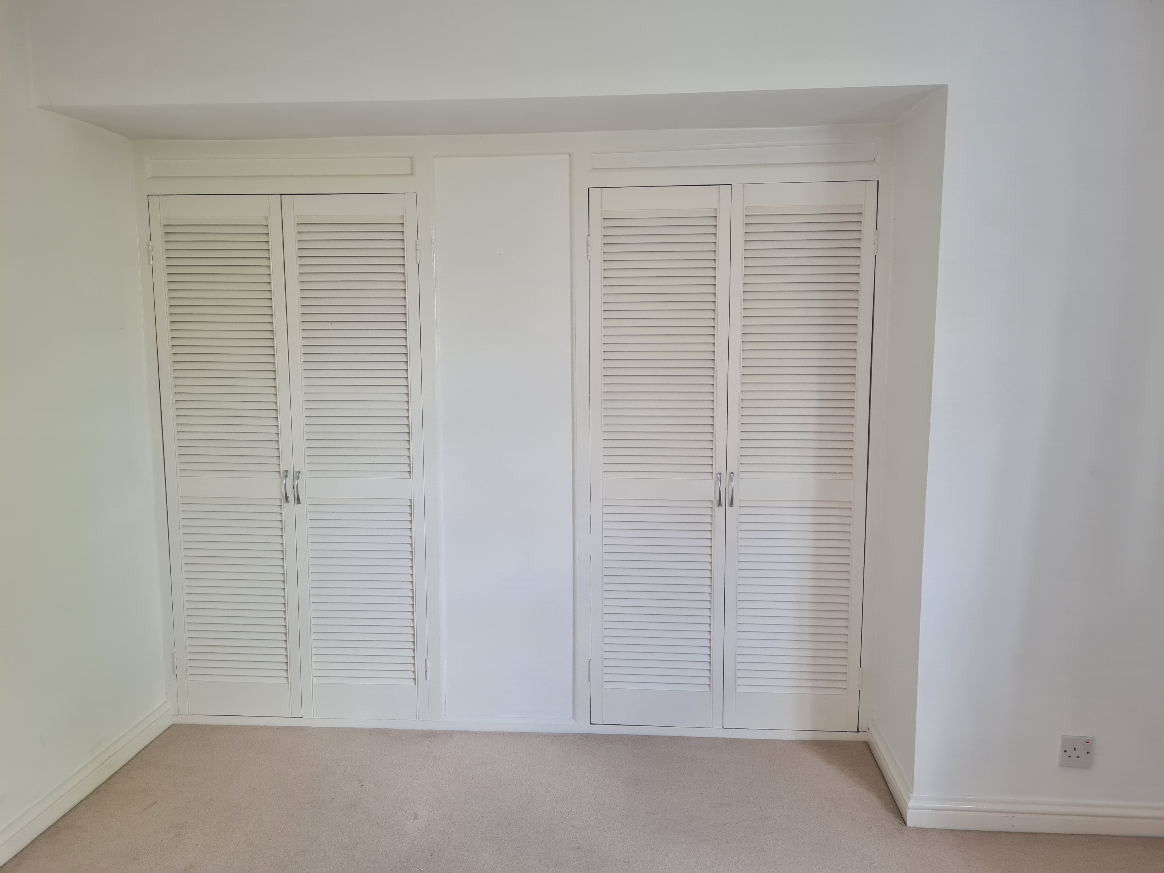 Bedroom 2: Located at the rear of the property, this double bedroom has white walls, beige carpet and neutral curtains.  There are 2 integrated double wardrobe with hanging rails and shelving.