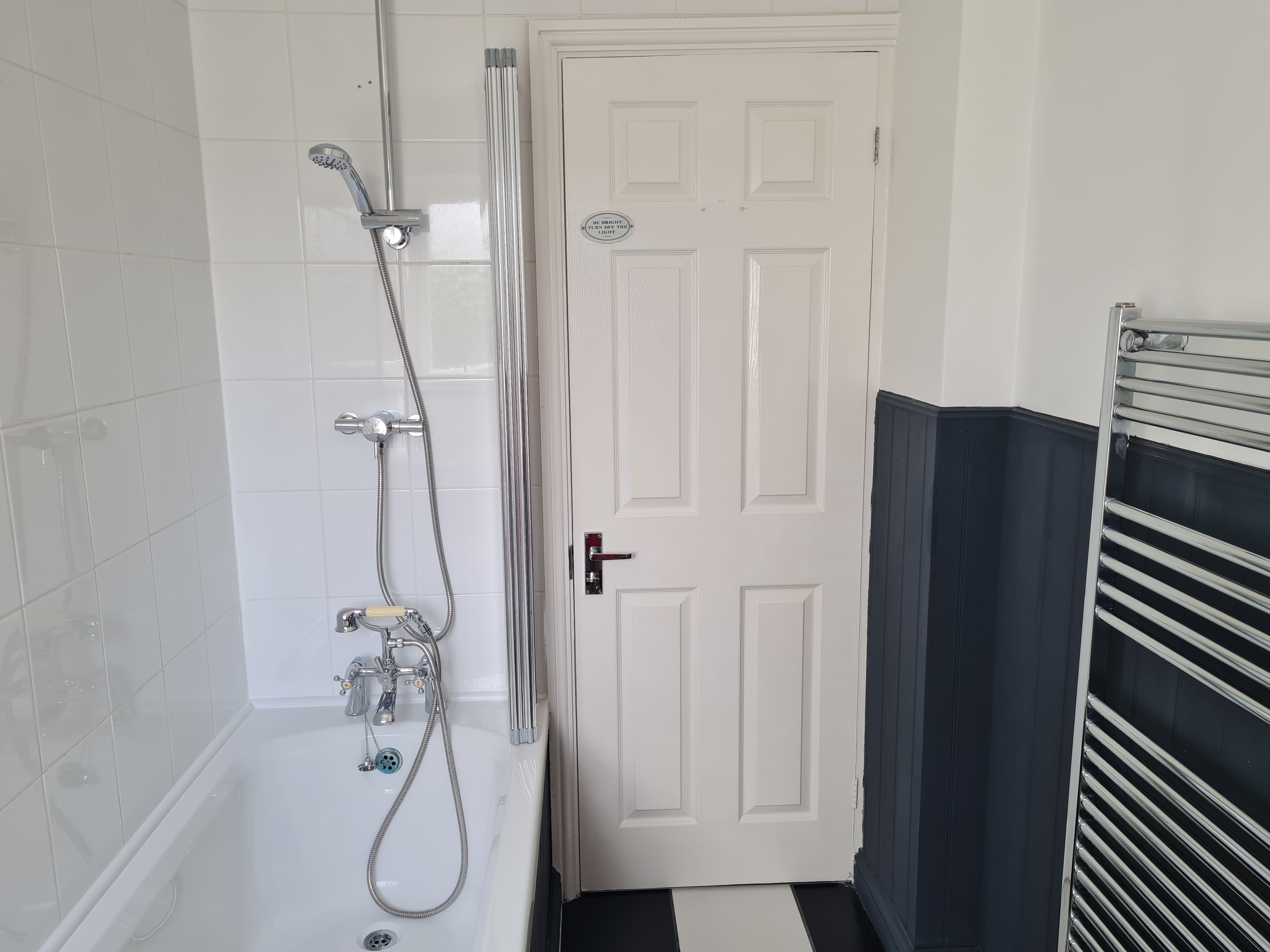 Family Bathroom: White suite comprising of basin with chrome taps, toilet with push flush and bath with folding shower screen  Thermostatic shower with additional mixer tap shower hose.  Chrome heated towel rail, towel ring and extractor.  Walls are tiled in white to wet areas with remaining walls white with grey wood panelling.  Black and white tile effect vinyl flooring.