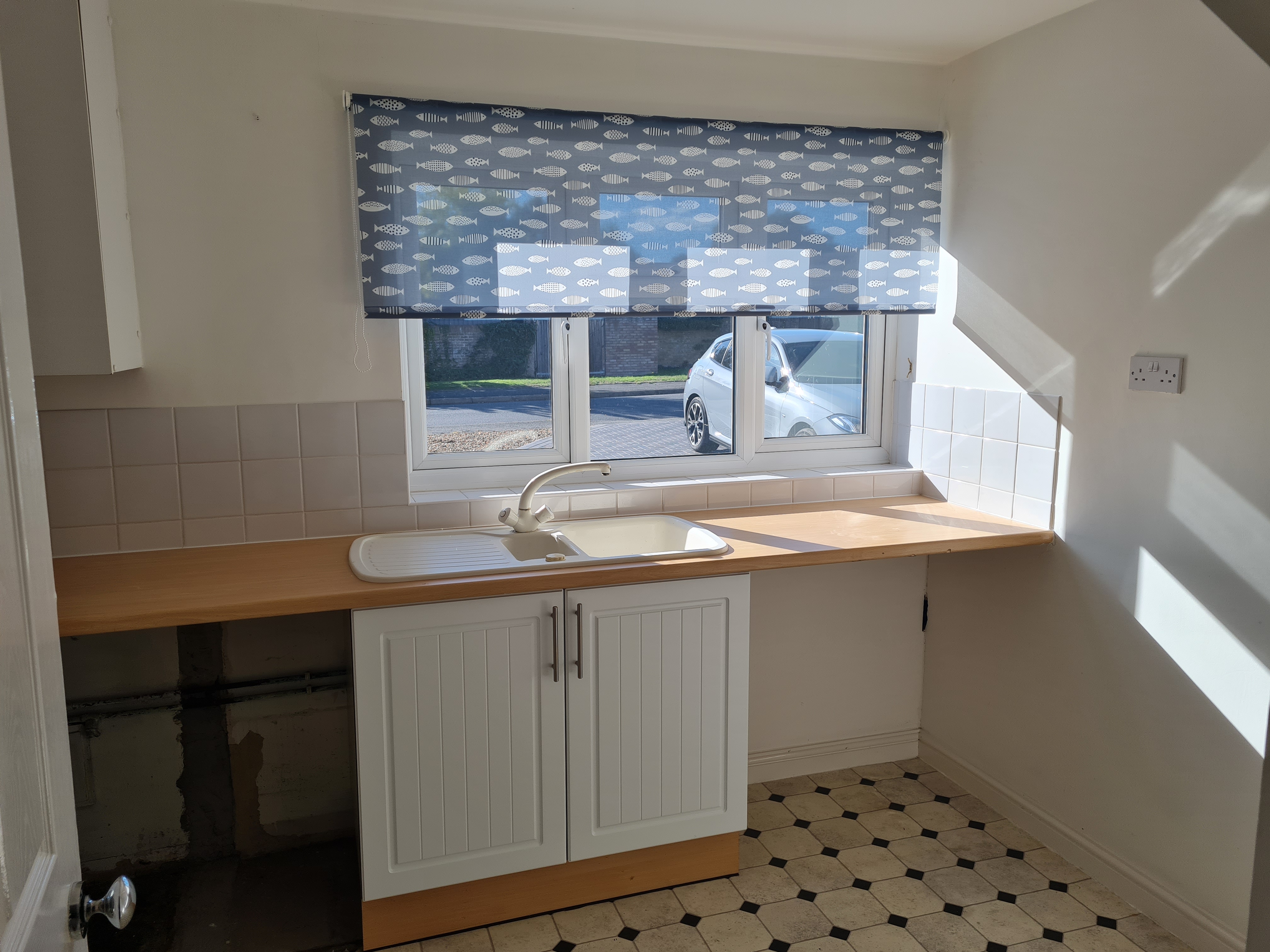 Utility room: Cream shaker style wall and base units with wood effect laminate worktop.  White walls, tiled splashbacks and tile effect vinyl flooring.  Space and plumbing available for a washing machine, tumble dryer and fridge freezer.  White 1.5 sink/drainer with white mixer tap. Cupboard housing the boiler.