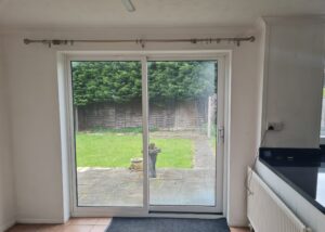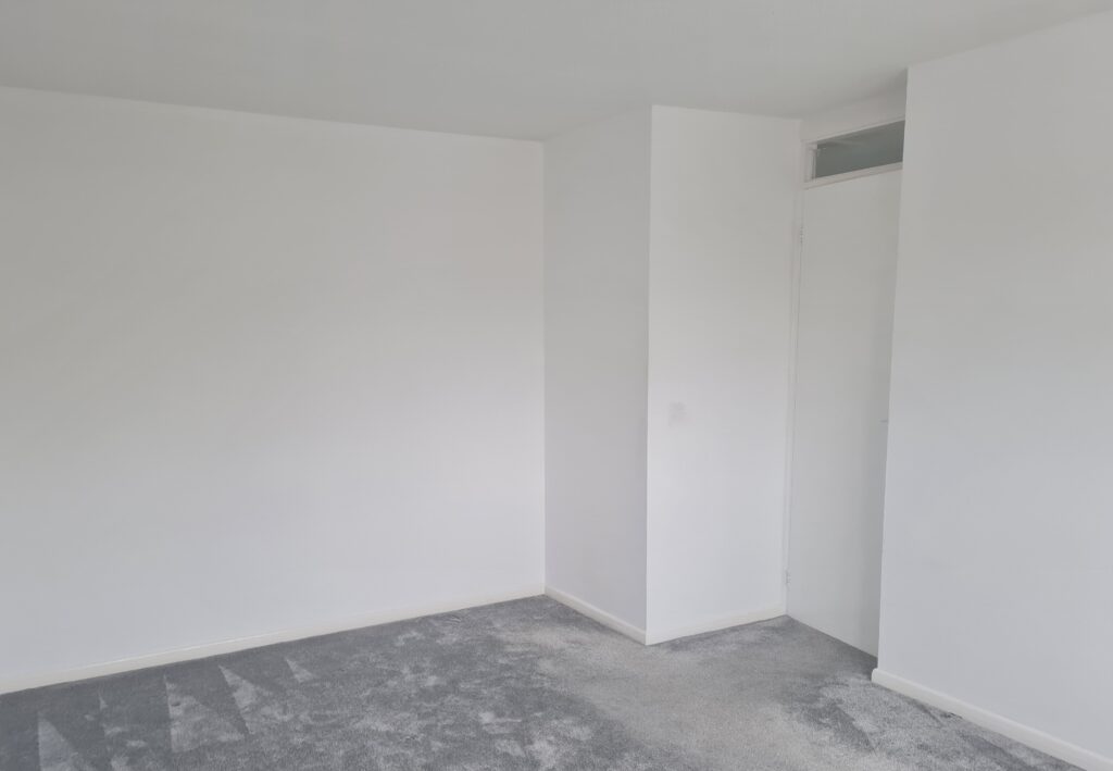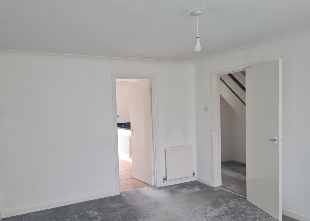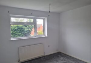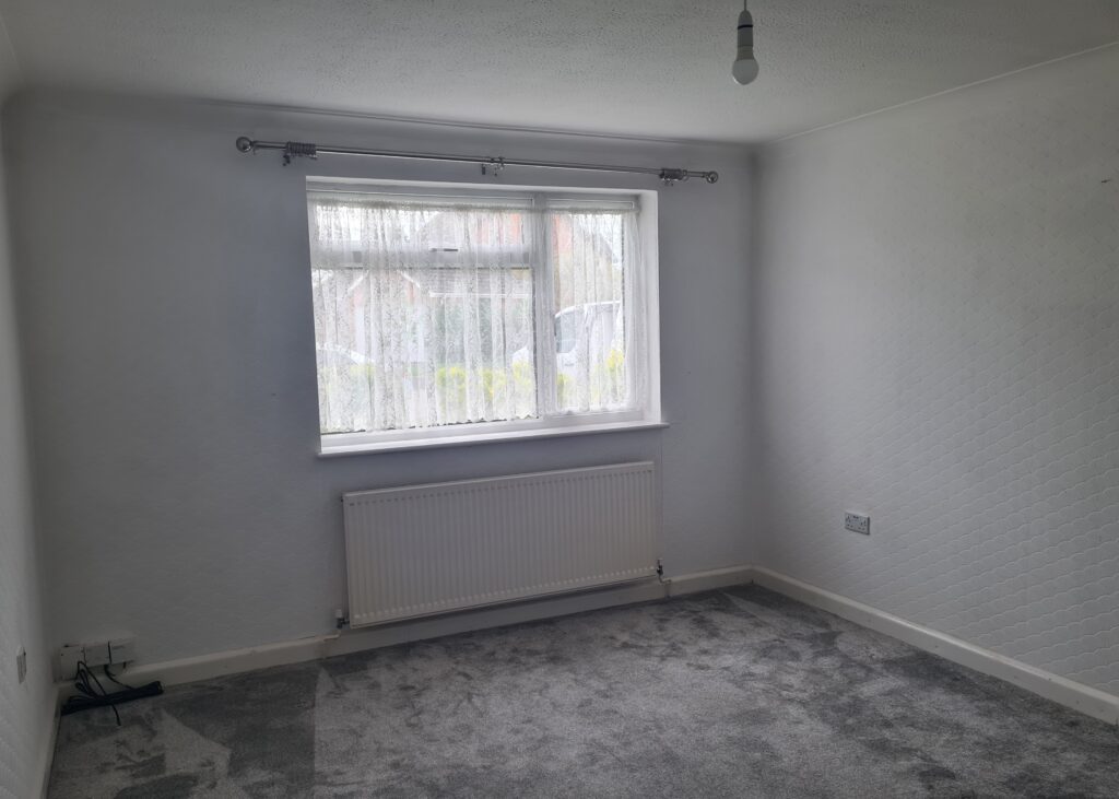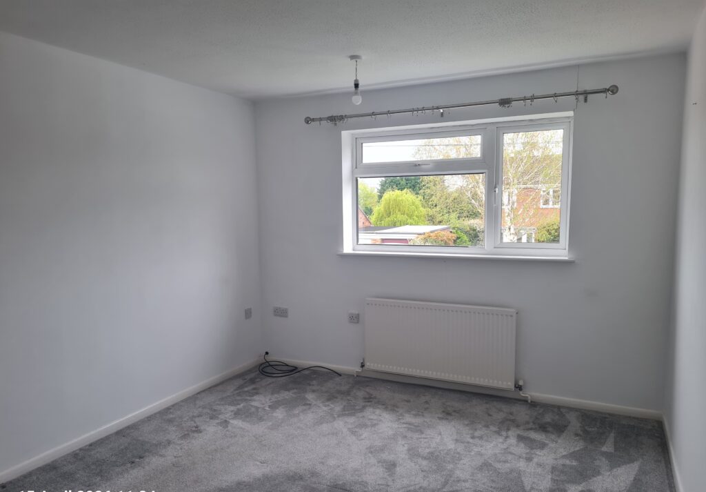 Bedroom 2: Good size double bedroom at the rear of the property. White walls, new grey carpet and Virgin media box.