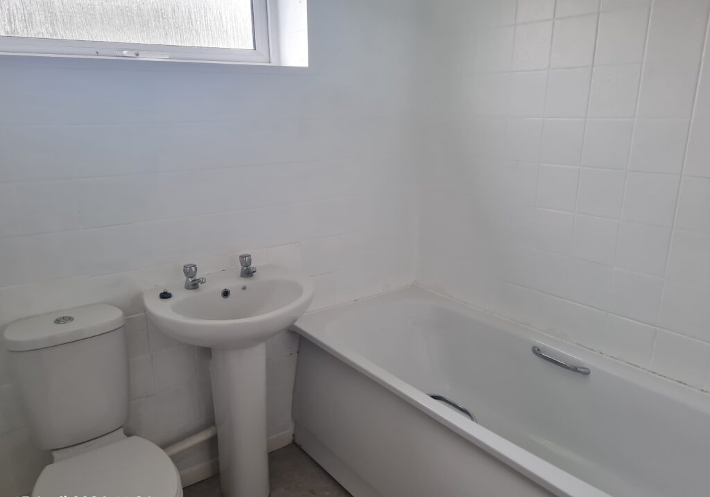 Bathroom: White suite comprising of toilet, basin with chrome taps, bath with Triton electric shower above and chrome taps. Chrome heated towel rail. Walls are fully tiled in white painted tiles. Grey vinyl flooring.