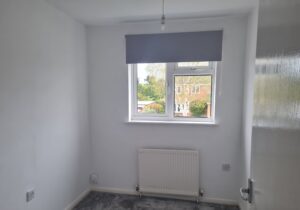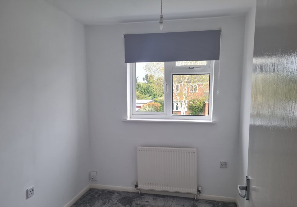 Bedroom 3: Single bedroom located at the front of the property. White walls and new grey carpet. Grey roller blind and TV aerial socket.