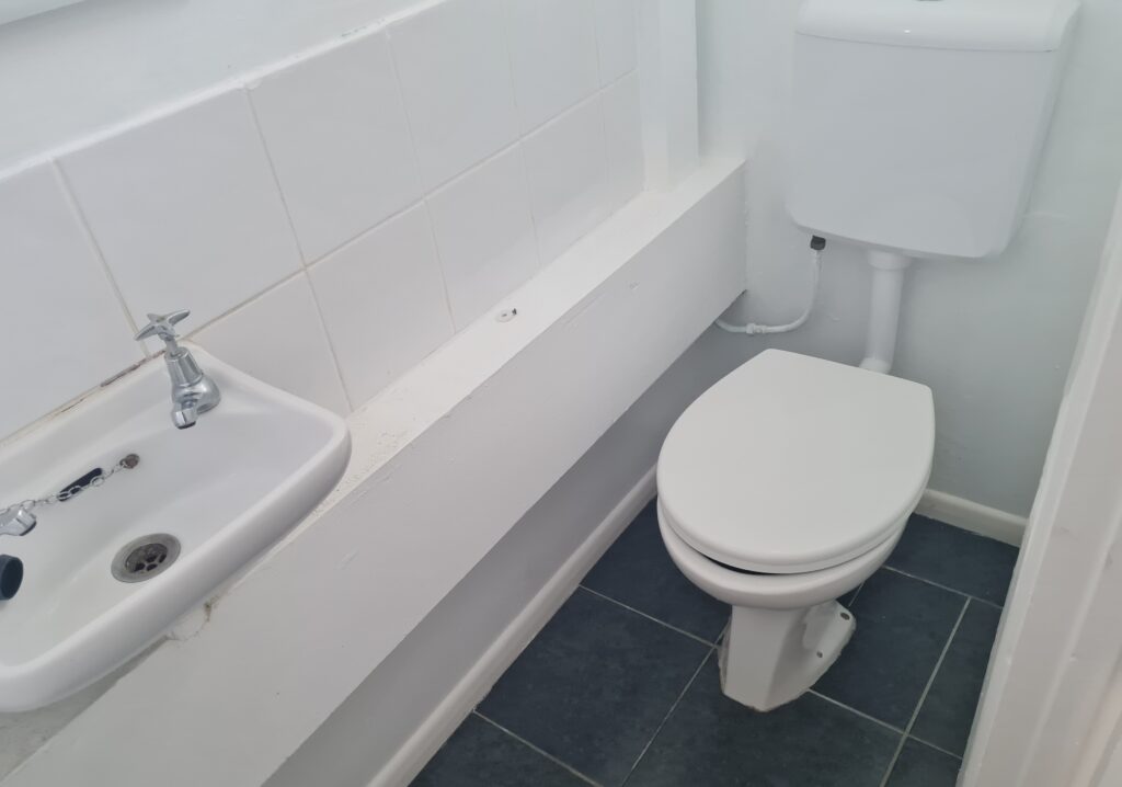 Cloakroom: White basin with chrome taps, toilet with push flush. White walls and tiled splashback. Grey tiled flooring.