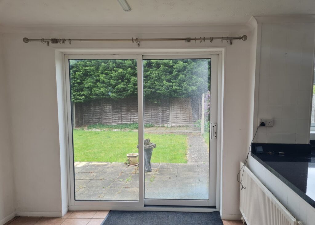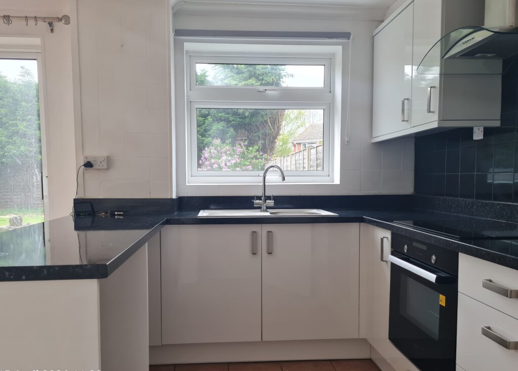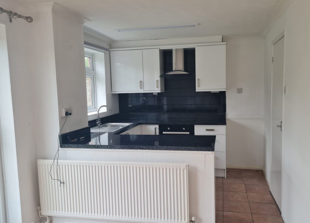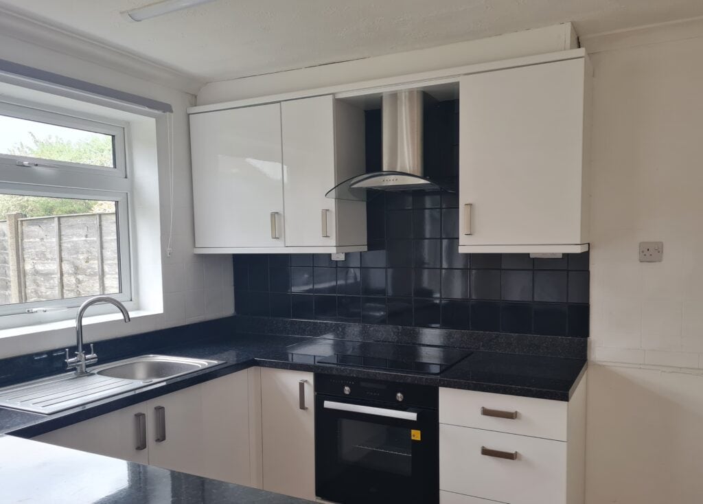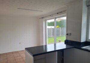 Kitchen/Diner: White high gloss fitted kitchen units with black granite effect worktop and white tiling. Stainless steel sink/drainer with chrome mixer tap. Space and plumbing available for a washing machine, dishwasher and fridge/freezer. Cooke & Lewis electric oven, hob and extractor. White walls and terracotta tiled flooring. Grey roller blind. The dining area has sliding doors leading to the garden and a large storage cupboard with shelving.
