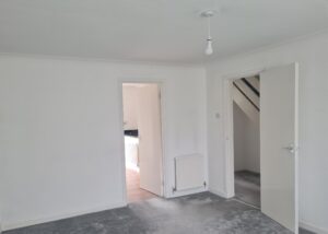 Lounge: White walls and new grey carpet. Doors leading to dining area and hall. Phone sockets and Virgin media box.